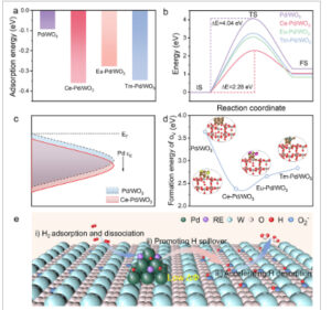 Dibandingkan dengan logam transisi 3d, tanah jarang (RE) dapat digunakan untuk memodulasi struktur elektronik Pd secara tepat dan berkesinambungan karena pengisian nomor elektron 4f yang tidak lengkap. [ 19 ] Di sini, atom tunggal RE yang mendoping nanopartikel Pd yang didukung pada nanorod WO 3 (RE-Pd/WO 3 ) disintesis untuk sensor H 2 yang cepat dan sensitifitas tinggi pada suhu mendekati suhu kamar. Fungsi kerja Pd dapat dimodulasi secara tepat dengan mendoping atom RE (Ce, Nd, Eu, Tb, Ho, dan Tm), akibatnya, ΔФ menurun dalam RE-Pd/WO 3 dibandingkan dengan Pd/WO 3 . Selain itu, ΔФ meningkat dengan peningkatan nomor elektron orbital 4f dalam RE, dan konsentrasi kekosongan oksigen menunjukkan tren yang berlawanan dengan ΔФ. Ce-Pd/WO 3 dengan ΔФ terendah menyajikan properti penginderaan H 2 terbaik pada suhu mendekati ruangan. Perhitungan teori fungsi densitas (DFT) mengungkapkan bahwa ΔФ terendah mengarahkan penghalang energi luapan hidrogen terendah, sedangkan energi pembentukan kekosongan oksigen terendah memicu konsentrasi spesies oksigen (O 2 − ) tertinggi, yang memberikan Ce-Pd/WO 3 sensitivitas tertinggi dan waktu respons-pemulihan terpendek pada suhu mendekati ruangan, mengungguli sensor H 2 yang paling banyak dilaporkan . Luapan hidrogen yang ditingkatkan pada Ce-Pd/WO 3 selanjutnya dikonfirmasi oleh karakterisasi in situ dan eksperimen luapan hidrogen. Yang mengesankan, respons cepat terhadap kebocoran hidrogen pada baterai Al-air memverifikasi potensi aplikasi perangkat Ce-Pd/WO 3 pada suhu mendekati ruangan.