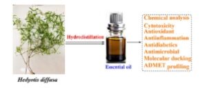 Hedyotis diffusa , ramuan obat yang banyak digunakan di Asia, belum banyak mengeksplorasi minyak atsiri. Penelitian ini bertujuan untuk menganalisis komposisi kimia dan aktivitas biologis minyak atsiri dari bagian udara H. diffusa . Minyak atsiri dari kulit batang dan daun diperiksa melalui kromatografi gas-deteksi ionisasi nyala/spektrometri massa. Aktivitas biologis dinilai menggunakan sitotoksisitas (MCF7, SK-LU-1, dan HepG2), antimikroba ( Bacillus subtilis ), penghambatan oksida nitrat (NO), antioksidan, dan uji antidiabetik. Docking molekuler menargetkan protein reseptor faktor pertumbuhan epidermal manusia 2 (HER2) dan limfoma sel B 2 (BCL2), dengan profil Penyerapan, Distribusi, Metabolisme, Ekskresi, dan Toksisitas (ADMET) yang memprediksi farmakokinetik. Senyawa utama dari minyak atsiri termasuk asam heksadekanoat (22,7%–24,5%), pentadekanal (15,4%–16,0%), dan (5 E ,9 Z )-farnesil aseton (13,0%), di samping sikloheksil antranilat (6,2%) dan cis -fitol (4,8%–5,5%). Minyak atsiri kulit batang menunjukkan sitotoksisitas yang kuat (konsentrasi penghambatan 50% [IC 50 ]: 10,86–14,92 µg/mL) dan aktivitas antimikroba (konsentrasi penghambatan minimum: 32 µg/mL terhadap B. subtilis ), sementara kedua minyak atsiri menghambat produksi NO (IC 50 : 36,81–40,58 µg/mL) dengan efek antioksidan dan antidiabetik sedang. Docking menunjukkan afinitas sikloheksil antranilat untuk HER2 (ΔG: –8,423 kkal/mol) dan (5 E ,9 Z )-farnesil aseton untuk BCL2 (ΔG: –5,81 kkal/mol), dengan profil ADMET yang baik. Minyak atsiri dari bagian udara H. diffusa Vietnam menunjukkan bioaktivitas dan farmakokinetik yang menjanjikan, mendukung penggunaan tradisional dan menjamin penelitian pengobatan lebih lanjut.