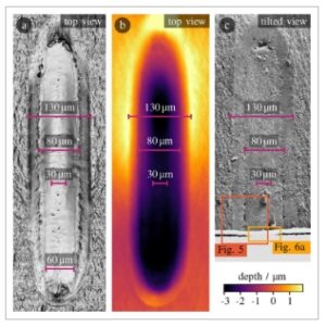 Lokasi karakteristik berikutnya ditemukan pada lebar 60 µm. Di sini, garis hitam halus yang terputus sebagian terlihat pada gambar mikroskop medan terang 4a . Untuk parameter proses yang sama, simulasi yang ditunjukkan pada bagian 3.4 menghasilkan bak lelehan yang menembus kolam lelehan Al pada lebar