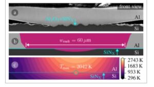 a) SEM close-up dari penampang sambungan; b) simulasi set parameter yang dioptimalkan yang ditunjukkan pada Tabel 1 pada saat ekspansi kolam lelehan maksimum yang menunjukkan kolam lelehan berwarna magenta dan lebarnya w lelehan (bandingkan titik kuning pada Gambar 8 kanan) pada antarmuka ikatan; c) distribusi suhu simulasi di atas yang menunjukkan suhu antarmuka maksimum T maks (bandingkan titik kuning pada Gambar 8 tengah). Suhu karakteristik ditandai pada peta warna (rendah ke tinggi): Suhu ruangan, titik leleh Al, titik leleh Si, titik didih Al.